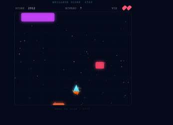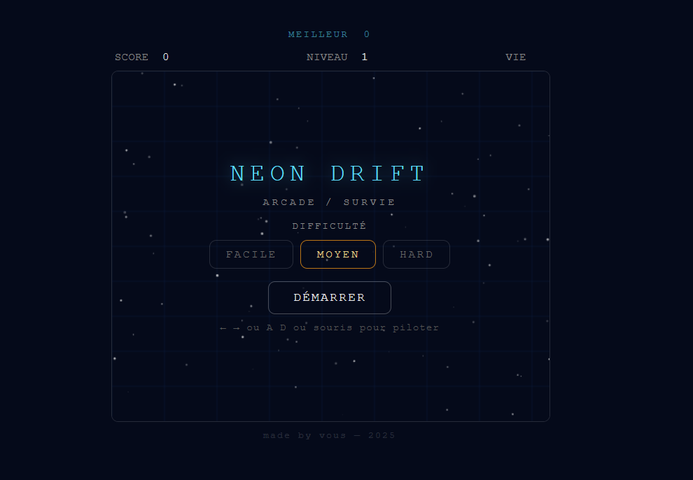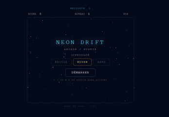 Neon Drift is an old-school arcade survival game set in deep space. Pilot your ship through a corridor of glowing debris that gets faster and denser with every level. Dodge, survive, beat your high score.